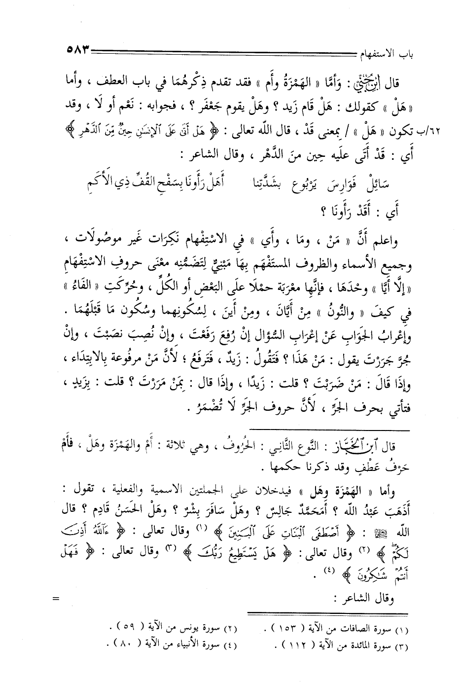 قال ابن جني: وأما «الهمزة وأم» فقد تقدم ذكرهما في باب العطف, وأما «هل» كقولك: هل قام زيد؟ وهل يقوم جعفر؟ , فجوابه: نعم أو لا, وقد تكون «هل» بمعنى قد, قال الله تعالى: {هل أتى على الإنسان حين من الدهر} أي: قد أتى عليه حين من لدهر, وقال الشاعر: