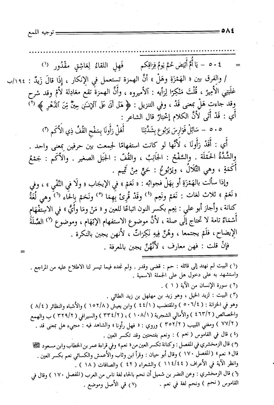 وإذا سألت بالهمزة أو بهل فجوابه: «نعم» في الإيجاب «ولا في النفي» , وفي «نعم» ثلاث لغات: نعم ونعم وقد قرئ بهما ونحم بالحاء وهي لغة كنانة, وأجاز أبو علي: نعم بكسر النون اتباعًا للعين و «من وما وأي» في الاستفهام أسماء تامة لا تحتاج إلى صلة, لأن موضوع الاستفهام الإبهام, وموضوع الصلة الإيضاح, فلم يجتمعا, وهن فيه نكرات, لأنهن يجبن بالنكرة.