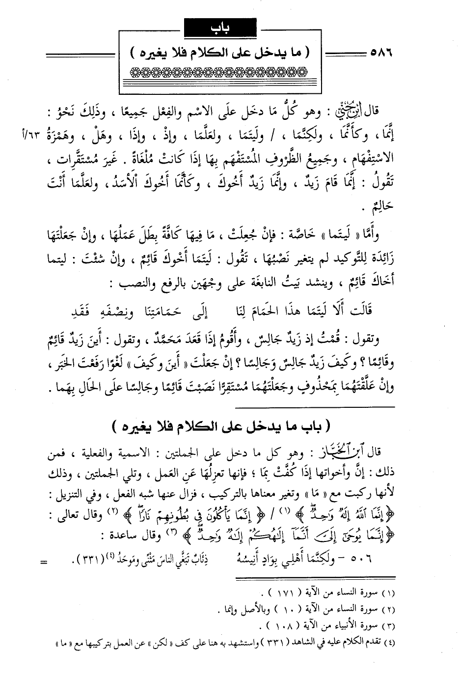 وأما «ليتما» خاصة: فإن جعلت, ما فيها كافة بطل عملها, وإن جعلتها زائدة للتوكيد لم يتغير نصبها, تقول: ليتما أخوك قائم, وإن شئت: ليتما أخاك قائم, وينشد بيت النابغة على وجهين بالرفع والنصب: