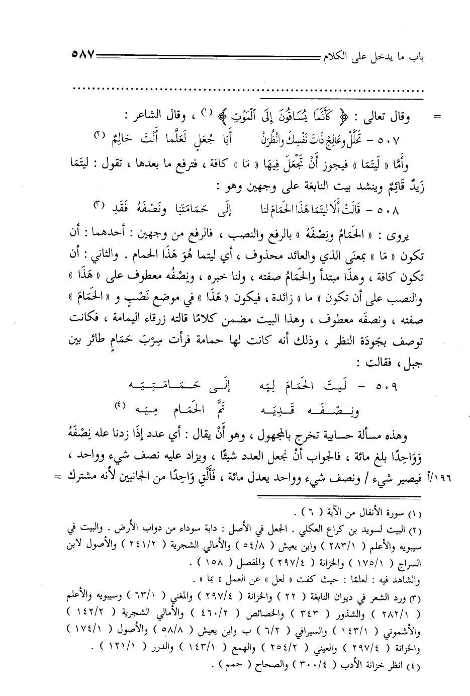 يروى: «الحمام ونصفه» بالرفع والنصب, فالرفع من وجهين: أحدهما: أن تكون «ما» بمعنى الذي والعائد محذوف, أي ليتما هو هذا الحمام. والثاني: أن تكون كافة, وهذا مبتدأ والحمام صفته, ولنا خبره, ونصفه معطوف على «هذا» والنصب على أن تكون «ما» زائدة, فيكون «هذا» في موضع نسب و «الحمام» صفته, ونصفه معطوف, وهذا البيت مضمن كلامًا قالته زرقاء اليمامة, فكانت توصف بجودة النظر, وذلك أنه كانت لها حماة فرأت سرب حمام طائر بين جبل, فقالت: