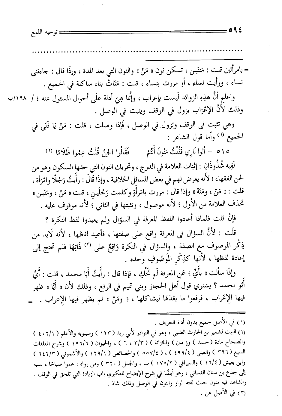ففيه شذوذان: إثبات العلامة في الدرج, وتحريك النون التي حقها السكون وهو من لحن الفقهاء, لأنه يعرض لهم في بعض المسائل الخلافية, وإذا قال: رأيت رجلًا وامرأة, قلت: «من, ومنه» وإذا قال: مررت بامرأة وكلمت رجلين, قلت: «من, ومنين» تحذف العلامة من الأول, لأنه موصول, وتثبتها في الثاني, لأنه موقوف عليه. فإن قلت فلماذا أعادوا اللفظ المعرفة في السؤال ولم يعيدوا لفظ النكرة؟ قلت: لأن السؤال في المعرفة واقع على صفتها, فأعيد لفظها, لأنه لابد من ذكر الموصوف مع الصفة, والسؤال في النكرة واقع على ذاتها فلم تحتج إلى إعادة لفظها, لأنها كذكر الموصوف وحده.