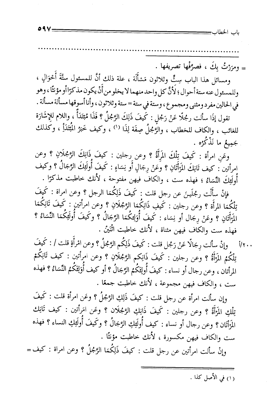 ومسائل هذا الباب ست وثلاثون مسألة, علة ذلك أن للمسئول ستة أحوال, وللمسئول عنه ستة أحوال, لأن كل واحد منهما لا يخلو من أن يكون مذكرًا أو مؤنثًا, وهو في الحالين مفرد ومثنى ومجموع, وستة في ستة = ستة وثلاثون, وأنا أسوقها مسألة مسألة. تقول إذا سألت رجلًا عن رجل: كيف ذلك الرجل؟ فذا مبتدأ, واللام للإشارة للغائب, والكاف للخطاب, والرجل صفة لذا, وكيف خبر المبتدأ, وكذلك جميع ما تذكره.