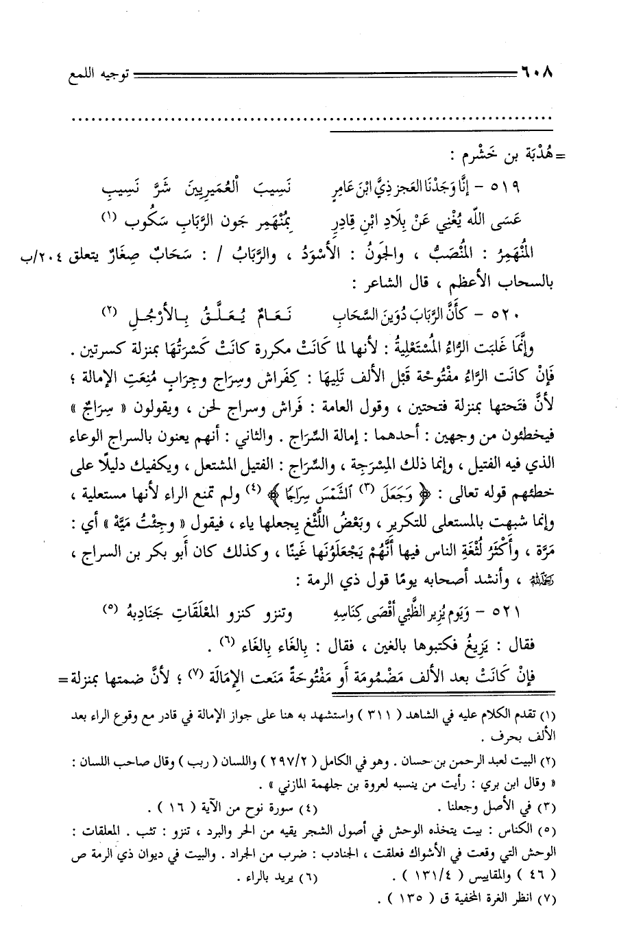 وإنما غلبت الراء المستعلية: لأنها لما كانت مكررة كانت كسرتها بمنزلة كسرتين. فإن كانت الراء مفتوحة قبل الألف تليها: كفراش وسراج وجراب منعت الإمالة, لأن فتحتها بمنزلة فتحتين, وقول العامة: فراش وسراج لحن, ويقولون: «سراج» فيخطئون من وجهين: أحدهما: إمالة السراج. والثاني: أنهم يعنون بالسراج الوعاء الذي فيه القتيل, وإنما ذلك المشرجة, والسراج: الفتيل المشتعل, ويكفيك دليلًا على خطئهم قوله تعالى: {وجعل الشمس سراجًا} ولم تمنع الراء لأنها مستعلية, وإنما شبهت بالمستعلى للتكرير, وبعض اللثغ بجعلها ياء, فيقول «وجئت ميه» أي: مرة, وأكثر لثغة الناس فيها أنهم يجعلونها غينًا, وكذلك كان أبو بكر بن السراج, رحمه الله, وأنشد أصحابه يومًا قول ذي الرمة: