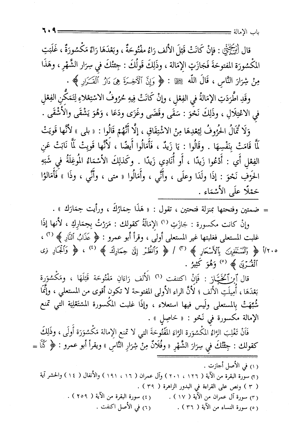 ضمتين وفتحتها بمنزلة فتحتين, تقول: «هذا حمارك, ورأيت حمارك». وإن كانت مكسورة: جازت الإمالة كقولك: مررت بحمارك, لأنها إذا غلبت المستعلى فغلبتها غير المستعلى أولى, وقرأ أبو عمرو: {عذاب النار} , {والمستغفرين بالأسحار} / {وانظر إلى حمارك} , {والجار ذي القربى} وهو كثير.