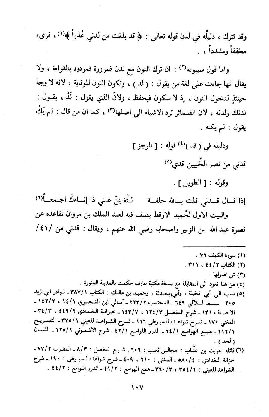 وأما قول سيبويه: إن ترك النون مع لدن ضرورة فمردود بالقراءة، ولا يقال إنها جاءت على من يقول: (لد)، وتكون النون للوقاية، لأنه لا وجه حينئذ لدخول النون؛ إذ لا سكون فيحفظ، ولأن الذي يقول: لَدُ، يقول: لدنك ولدنه، لأن الضمائر ترد الأشياء إلى أصلها، كما أن من قال: لم يَكُ يقول: لم يكنه.