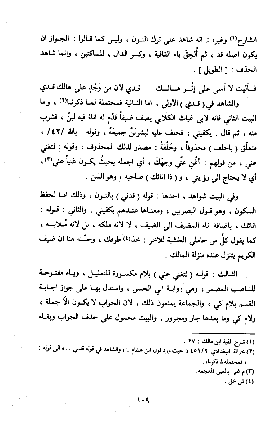 وفي البيت شواهد، أحدها: قوله (قدني) بالنون، وذلك إما لحفظ السكون، وهو قول البصريين، ومعناها عندهم يكفيني. والثاني: قوله: إنائك، بإضافة إناء المضيف إلى الضيف، لا لأنه ملكه، بل لأنه ملابسه، كما يقول كل من حاملي الخشبة للآخر: خذ طرفك، وحسنه هنا أن ضيف الكريم يتنزل عنده منزلة المالك.