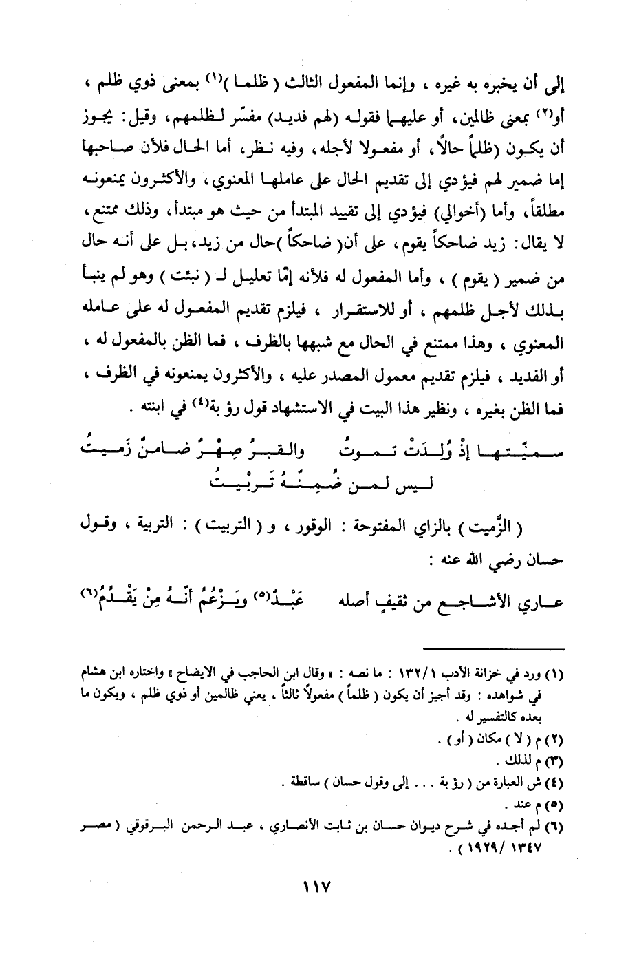إلى أن يخبره به غيره، وإنما المفعول الثالث (ظلما) بمعنى ذوي ظلم، أو بمعنى ظالمين، أو عليهما فقوله (لهم فديد) مفسر لظلمهم، وقيل: يجوز أن يكون (ظلمًا حالاً، أو مفعولاً لأجله، وفيه نظر، أما الحال فلأن صاحبها إما ضمير لهم فيؤدي إلى تقديم الحال على عاملها المعنوي، والأكثرون يمنعونه مطلقًا، وأما (أخوالي) فيؤدي إلى تقييد المبتدأ من حيث هو مبتدأ، وذلك ممتنع، لا يقال: زيد ضاحكًا يقوم، على أن (ضاحكًا) حال من زيد، بل على أنه حال من ضمير (يقوم)، وأما المفعول له فلأنه إما تعليل لـ (نبئت) وهو لم ينبأ بذلك لأجل ظلمهم، أو للاستقرار، فيلزم تقديم المفعول له على عامله المعنوي، وهذا ممتنع في الحال مع شبهها بالظرف، فما الظن بالمفعول له، أو الفديد، فيلزم تقديم معمول المصدر عليه، والأكثرون يمنعونه في الظرف، فما الظن بغيره، ونظير هذا البيت في الاستشهاد قول رؤبة في ابنته: