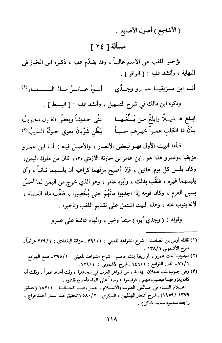 فأما البيت الأول فهو لبعض الأنصار، والأصل فيه: أنا بن عمرو مزيقيا، وعمرو هذا هو: ابن عامر بن حارثة الأزدي، كان من ملوك اليمن، وكان يلبس كل يوم حلتين، فإذا أصبح مزقهما كراهية أن يلبسهما ثانيًا، وأن يلبسهما غيره، فلقّب بذلك، وأبوه عامر، وهو الذي خرج من اليمن لما أحس بسيل العرم، وكان قومه إذا أجدبوا مانَهُمْ حتى يُخْصِبوا، فلقب ماء السماء، لأنه ينوب عنه، وهذا البيت اشتمل على تقديم اللقب وتأخيره.
