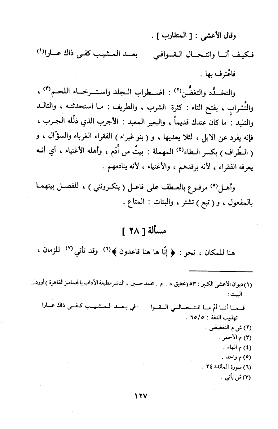 والتخدُّد والتغضُّن: اضطراب الجلد واسترخاء اللحم، والتشراب، بفتح التاء: كثرة الشرب، والطريف: ما استحدثته، والتالد والتليد: ما كان عندك قديمًا، والبعير المعبد: الأجرب الذي ذلله الجرب، فإنه يفرد عن الإبل، لئلا يعديها، و (بنو غبراء) الفقراء الغرباء والسؤال، و (الطّراف) بكسر الطاء المهملة: بيتٌ من أَدَم، وأهله الأغنياء، أي أنه يعرفه الفقراء، لأنه يرفدهم، والأغنياء، لأنه ينادمهم.
