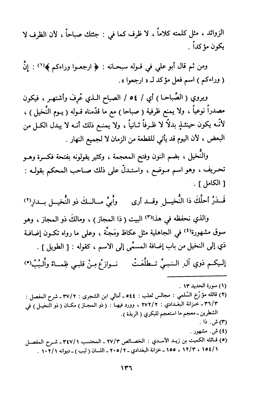 ويروي (الصباحا) أي /54/ الصباح الذي عُرِفَ واشتهر، فيكون مصدرًا نوعيًا، ولا يمنع ظرفية (صباحا) مع ما قدمناه قوله (يوم النخيل)، لأنه يكون حينئذ بدلاً لا ظرفًا ثانيًا، ولا يمنع ذلك أنه لا يبدل الكل من البعض، لأن اليوم قد يأتي للقطعة من الزمان لا لجميع النهار.