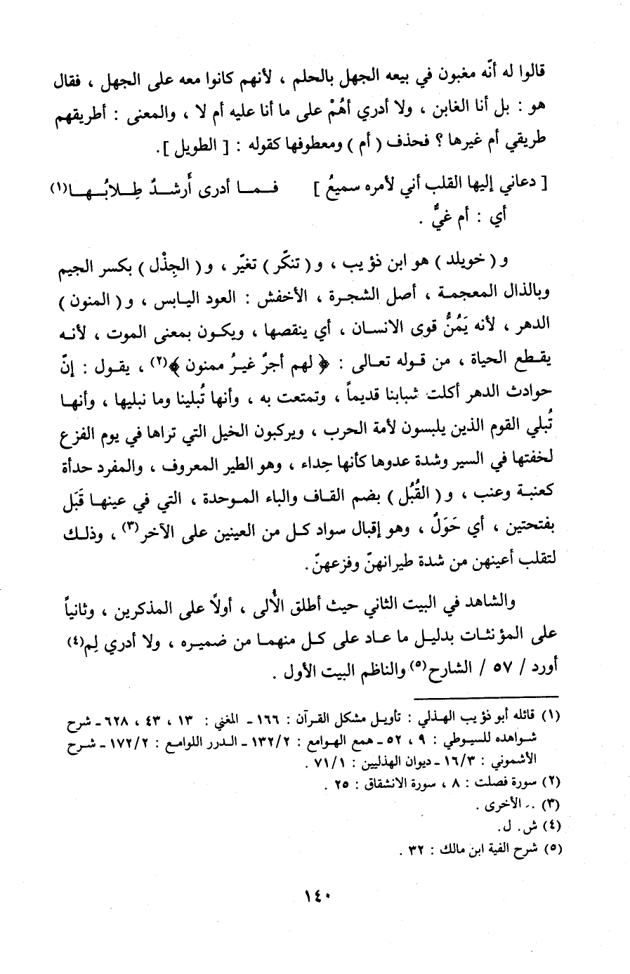 و (خويلد) هو ابن ذؤيب، و (تنكر) تغير، و (الجِذْل) بكسر الجيم، وبالذال المعجمة، أصل الشجرة، الأخفش: العود اليابس، و (المنون) الدهر، لأنه يَمُنُّ قوى الإنسان، أي ينقصها، ويكون بمعنى الموت، لأنه يقطع الحياة، من قوله تعالى {فَلَهُمْ أَجْرٌ غَيْرُ مَمْنُونٍ}، يقول: إن حوادث الدهر أكلت شبابنا قديمًا، وتمتعت به، وأنها تُبلينا وما نبليها، وأنها تُبلي القوم الذين يلبسون لأمة الحرب، ويركبون الخيل التي تراها في يوم الفزع لخفتها في السير وشدة عدوها كأنها حِداء، وهو الطير المعروف، والمفرد حدأة كعنبة وعنب، و (القُبُل) بضم القاف والباء الموحدة، التي في عينها قَبَل بفتحتين، أي حَوَلٌ، وهو إقبال سواد كل من العينين على الآخر، وذلك لتقلب أعينهن من شدة طيرانهن وفزعهن.