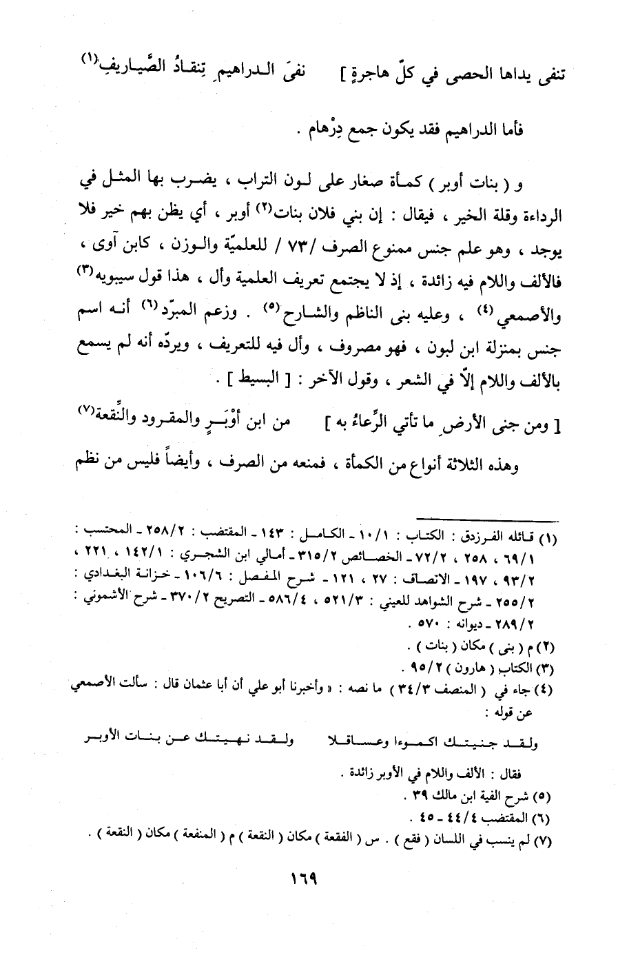 و (بنات أوبر) كمأة صغار على لون التراب، يضرب بها المثل في الرداءة وقلة الخير، فيقال: إن بني فلان بنات أوبر، أي يظن بهم خير فلا يوجد، وهو علم جنس ممنوع الصرف /73/ للعلمية والوزن، كابن آوى، فالألف واللام فيه زائدة، إذ لا يجتمع تعريف العلمية وأل، هذا قول سيبويه والأصمعي، وعليه بني الناظم والشارح. وزعم المبرد أنه اسم جنس بمنزلة ابن لبون، فهو مصروف، وأل فيه للتعريف، ويرده أنه لم يسمع بالألف واللام إلا في الشعر، وقول الآخر: [البسيط].