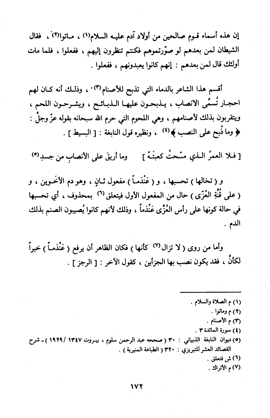 أقسم هذا الشاعر بالدماء التي تذبح للأصنام، وذلك أنه كان لهم أحجار تُسمَّى الأنصاب، يذبحون عليها الذبائح، ويشرحون اللحم، ويتقربون بذلك لأصنامهم، وهي اللحوم التي حرم الله سبحانه بقوله عز وجل: {وَمَا ذُبِحَ عَلَى النُّصُبِ}، ونظيره قول النابغة: [البسيط].