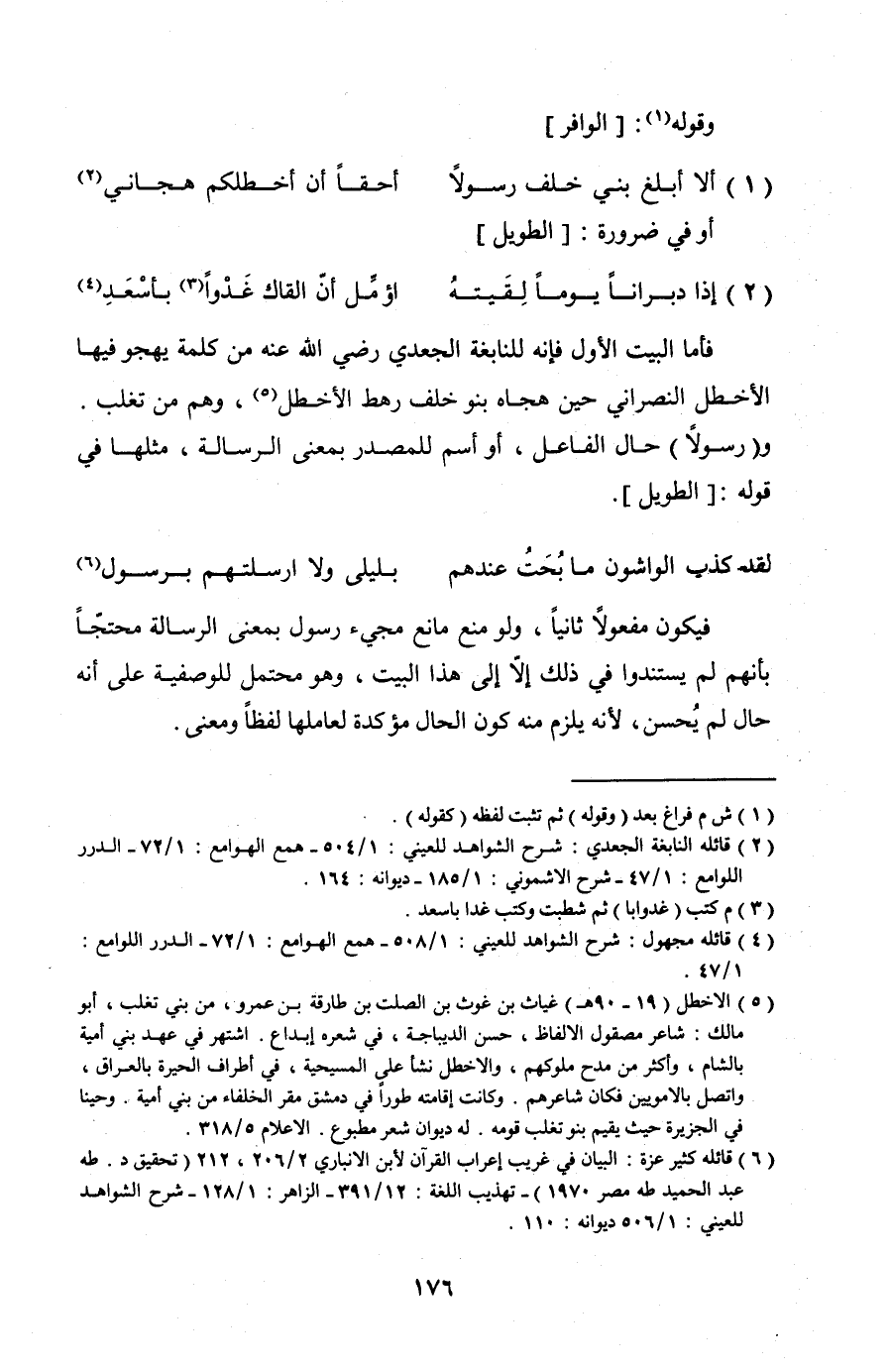 فأما البيت الأول فإنه للنابغة الجعدي رضي الله عنه من كلمة يهجو فيها الأخطل النصراني حين هجاه بنو خلف رهط الأخطل، وهم من تغلب. و (رسولاً) حال الفاعل، أو اسم للمصدر بمعنى الرسالة، مثلها في قوله: [الطويل].