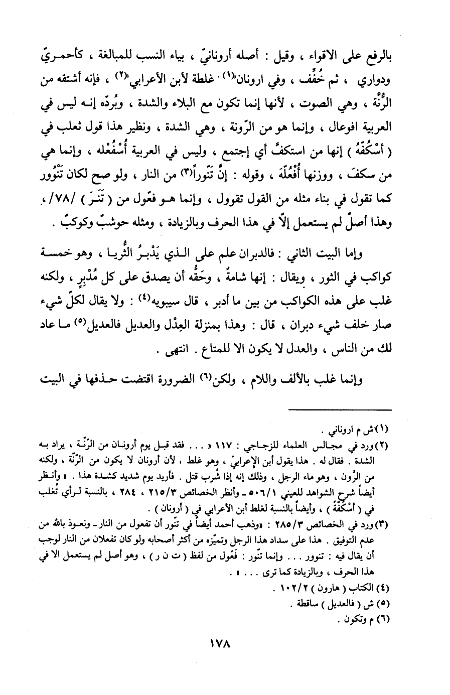 بالرفع على الأقواء، وقيل: أصله أروناني، بياء النسب للمبالغة، كأحمري ودواري، ثم خُفِّف، وفي أرونان، غلطة لابن الأعرابي، فإنه اشتقه من الرُّنَّة، وهي الصوت، لأنها إنما تكون مع البلاء والشدة، وبُردّه إنه ليس في العربية أفوعال، وإنما هو من الرّونة، وهي الشدة، ونظير هذا قول ثعلب في (أسْكُفّهُ) إنها من استكفَّ أي اجتمع، وليس في العربية أُسْفُعْله، وإنما هي من سكفَ، ووزنها أُفْعُلّه، وقوله: إنَّ تَنّورًا من النار، ولو صح لكان تَنْوور كما تقول في بناء مثله من القول تقوول، وإنما هو فعول من (تَنَرَ) /78/، وهذا أصلٌ لم يستعمل إلا في هذا الحرف وبالزيادة، ومثله حوشبٌ وكوكبٌ.