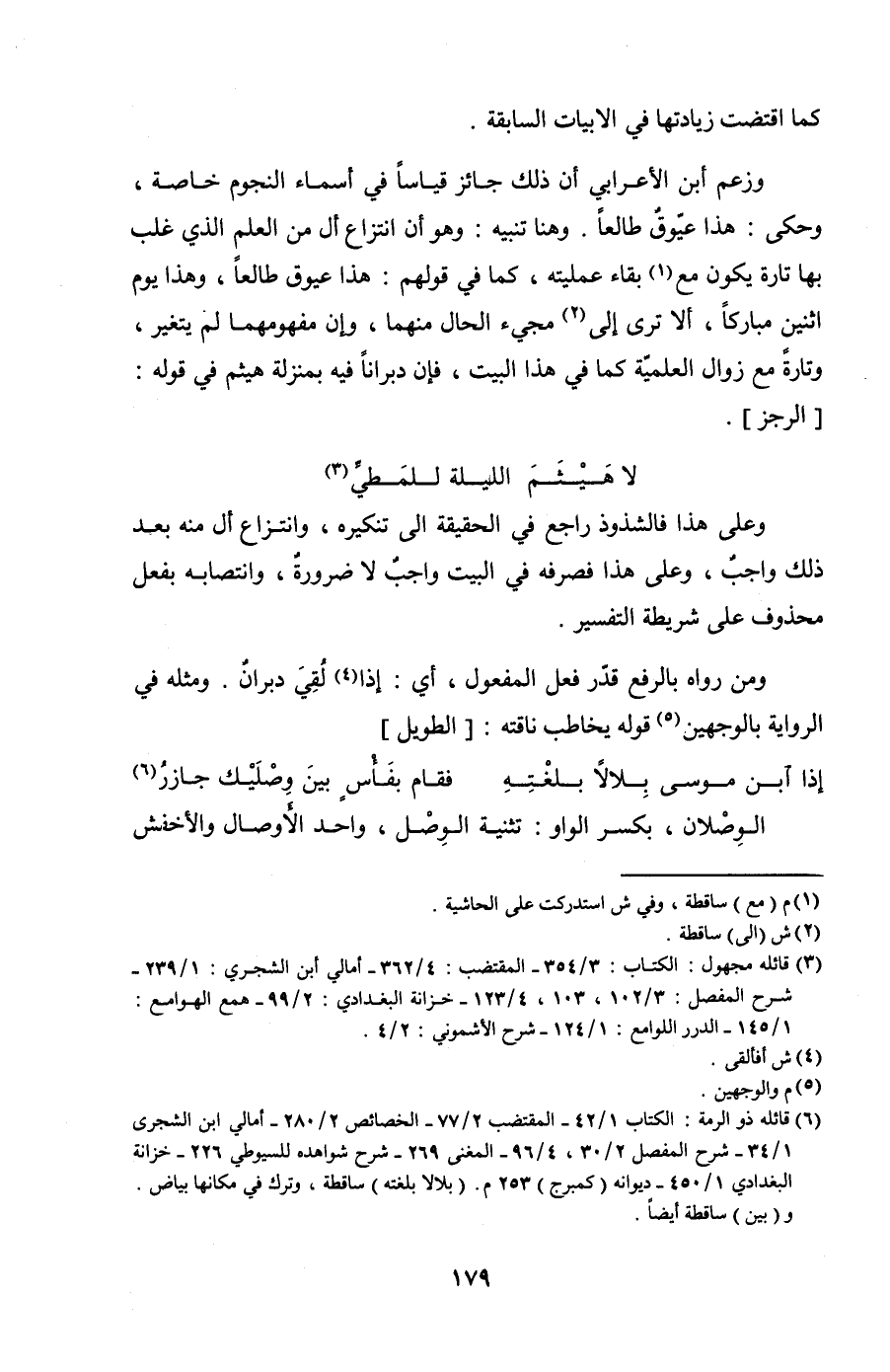 وزعم ابن الأعرابي أن ذلك جائز قياسًا في أسماء النجوم خاصة، وحكى: هذا عيّوقٌ طالعًا. وهنا تنبيه: وهو أن انتزاع أل من العلم الذي غلب بها تارة يكون مع بقاء عمليته، كما في قولهم: هذا عيوق طالعًا، وهذا يوم اثنين مباركًا، ألا ترى إلى مجيء الحال منهما، وإن مفهومهما لم يتغير، وتارةًً مع زوال العلمية كما في هذا البيت، فإن دبرانًا فيه بمنزلة هيثم في قوله: [الرجز]