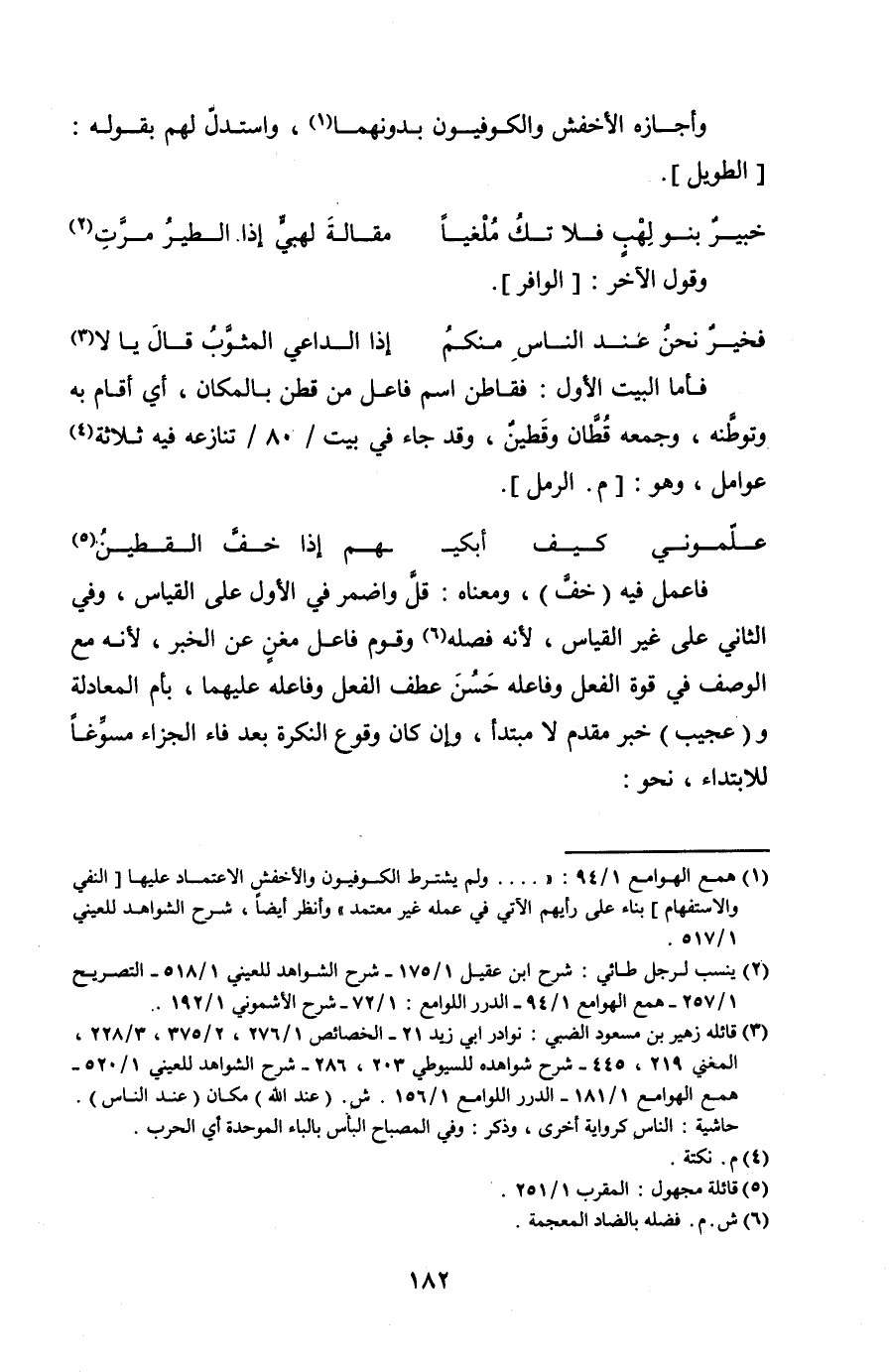 فأما البيت الأول: فقاطن اسم فاعل من قطن بالمكان، أي أقام به وتوطنه، وجمعه قُطَّان وقَطينٌ، وقد جاء في بيت /80/ تنازعه فيه ثلاثة عوامل، وهو: [م. الرمل].