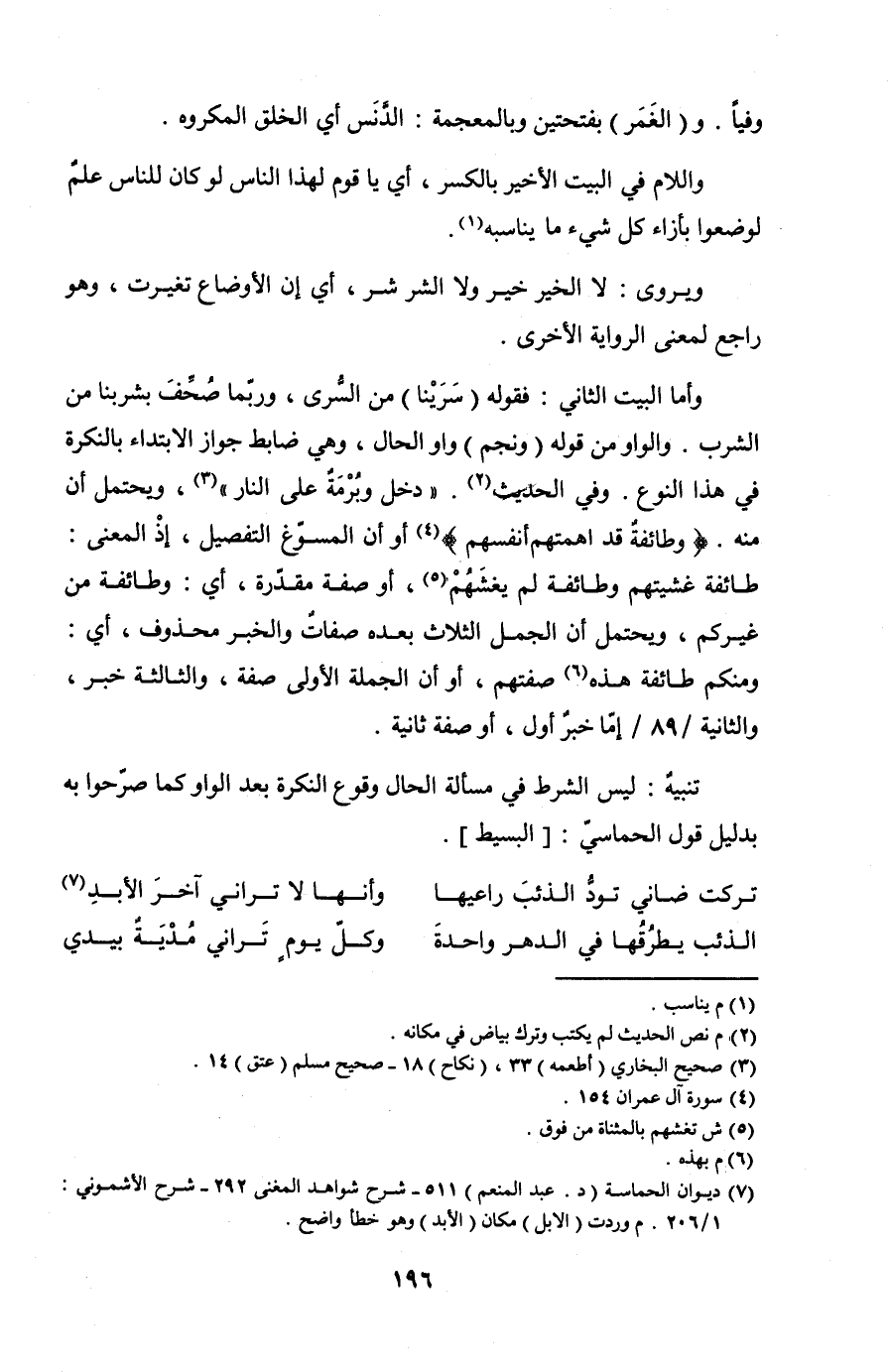 وأما البيت الثاني: فقوله (سَرَيْنا) من السُّرى، وربّما صحف بشربنا من الشرب، والواو من قوله (ونجم) واو الحال، وهي ضابط جواز الابتداء بالنكرة في هذا النوع. وفي الحديث: «دخل وبُرْمَةٌ على النار»، ويحتمل أن منه {وَطَائِفَةٌ قَدْ أَهَمَّتْهُمْ أَنفُسُهُمْ} أو أن المسوغ التفصيل، إذ المعنى: طائفة غشيتهم وطائفة لم يغشَهُمْ، أو صفة مقدرة، أي: وطائفة من غيركم، ويحتمل أن الجمل الثلاث بعده صفاتٌ والخبر محذوف، أي: ومنكم طائفة هذه صفتهم، أو أن الجملة الأولى صفة، والثالثة خبر، والثانية /89/ إما خبرٌ أول، أو صفة ثانية.