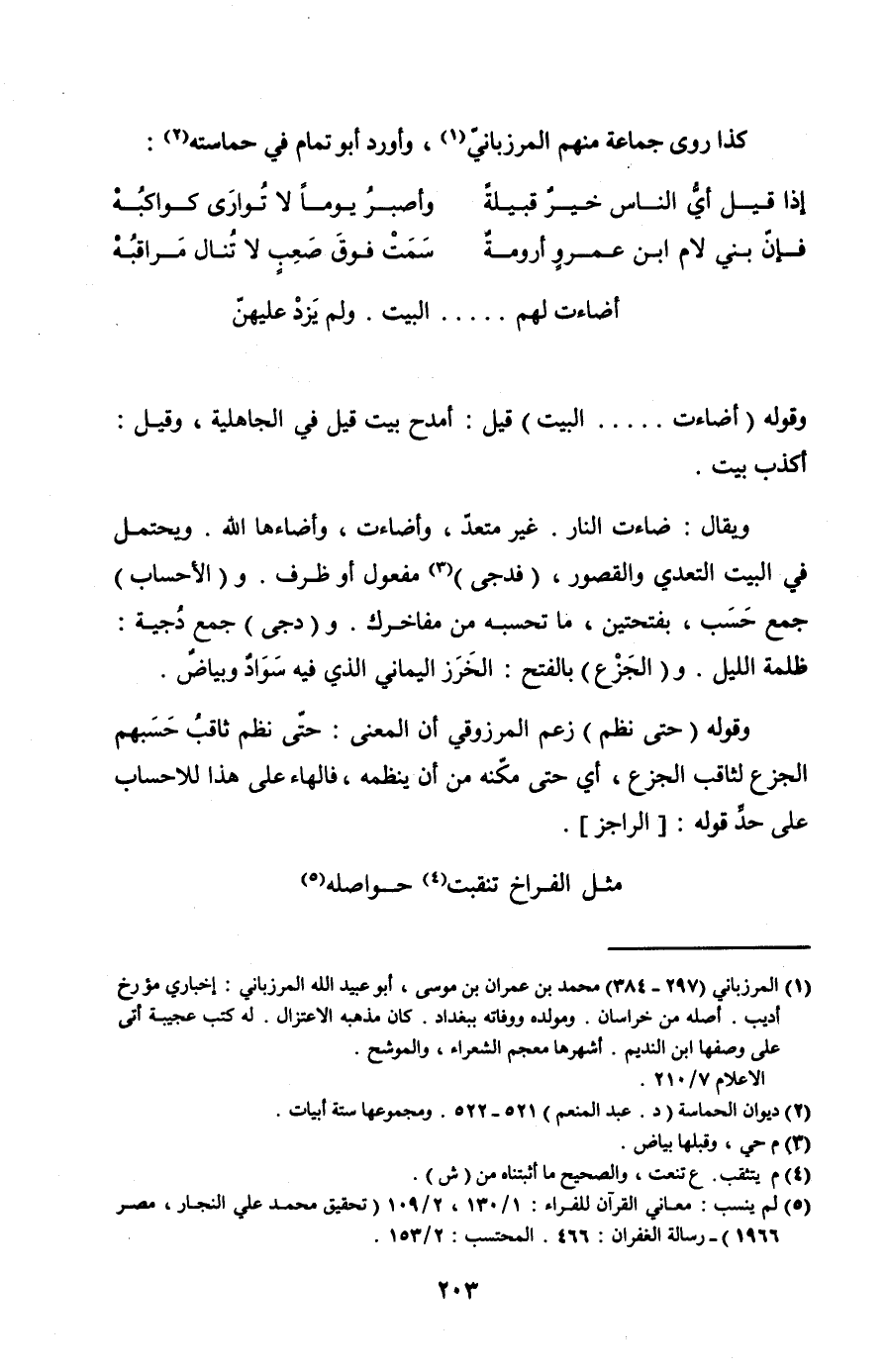 ويقال: ضاءت النار. غير متعد، وأضاءت، وأضاءها الله. ويحتمل في البيت التعدي والقصور، (فدجى) مفعول أو ظرف. و (الأحساب) جمع حَسَب، بفتحتين، ما تحسبه من مفاخرك. و (دجى) جمع دُجية: ظلمة الليل. و (الجَزْع) بالفتح: الخَرَز اليماني الذي فيه سَوَادٌ وبياضٌ.