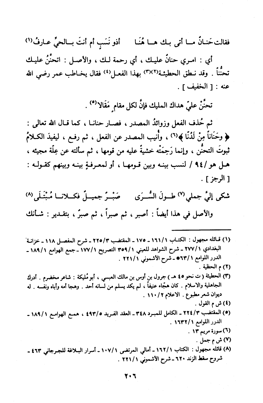 ثم حُذف الفعل وزوائد المصدر، فصار حنانًا، كما قال الله تعالى: {وَحَنَاناً مِّن لَّدُنَّا}، وأنيب المصدر عن الفعل، ثم رفع، ليفيدَ الكلامُ ثبوتَ التحنُّن، وإنما رَحِمَتْه خشية عليه من قومها، ثم سألته عن عِلة مجيئه، هل هو /94/ لنسب بينه وبين قومها، أو لمعرفة بينه وبينهم كقوله: [الرجز].
