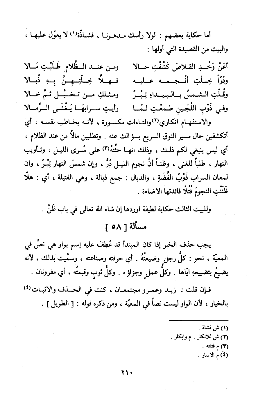 والاستفهام إنكاري والتاءات مكسورة، لأنه يخاطب نفسه، أي أتكشفين حال مسير النوق السريع بسؤالك عنه. وتطلبين مالاً من عند الظلام، أي ليس ينبغي لكم ذلك، وذلك أنها حثته على سُرى الليل، وتأويب النهار، طلبًا للغنى، وظنًا أن نجوم الليل در، وإن شمس النهار تبر، وإن لمعان السرب ذوب الفضة، والذبال: جمع ذبالة، وهي الفتيلة، أي: هلا ظننت النجوم فتلا فائدتها الإضاءة.