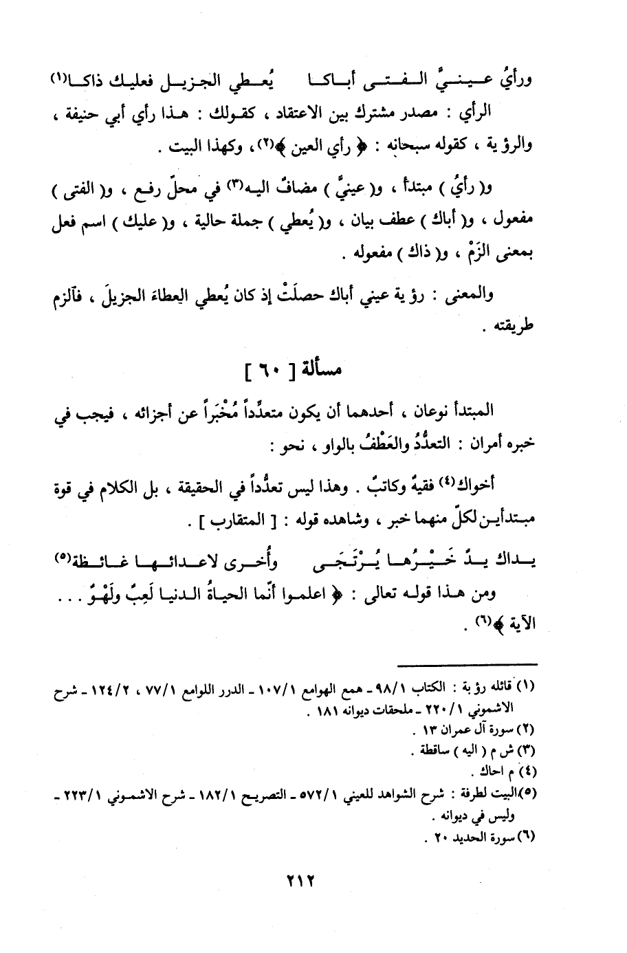 و (رأيُ) مبتدأ، و (عيني) مضاف إليه في محلّ رفع، و (الفتى) مفعول، و (أباك) عطف بيان، و (يُعطي) جملة حالية، و (عليك) اسم فعل بمعنى إلزَمْ، و (ذاك) مفعوله.