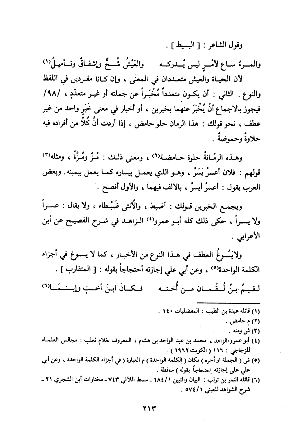 ولا يَسُوغُ العطف في هذا النوع من الأخبار، كما لا يسوغ في أجزاء الكلمة الواحدة، وعن أبي علي إجازته احتجاجًا بقوله: [المتقارب].