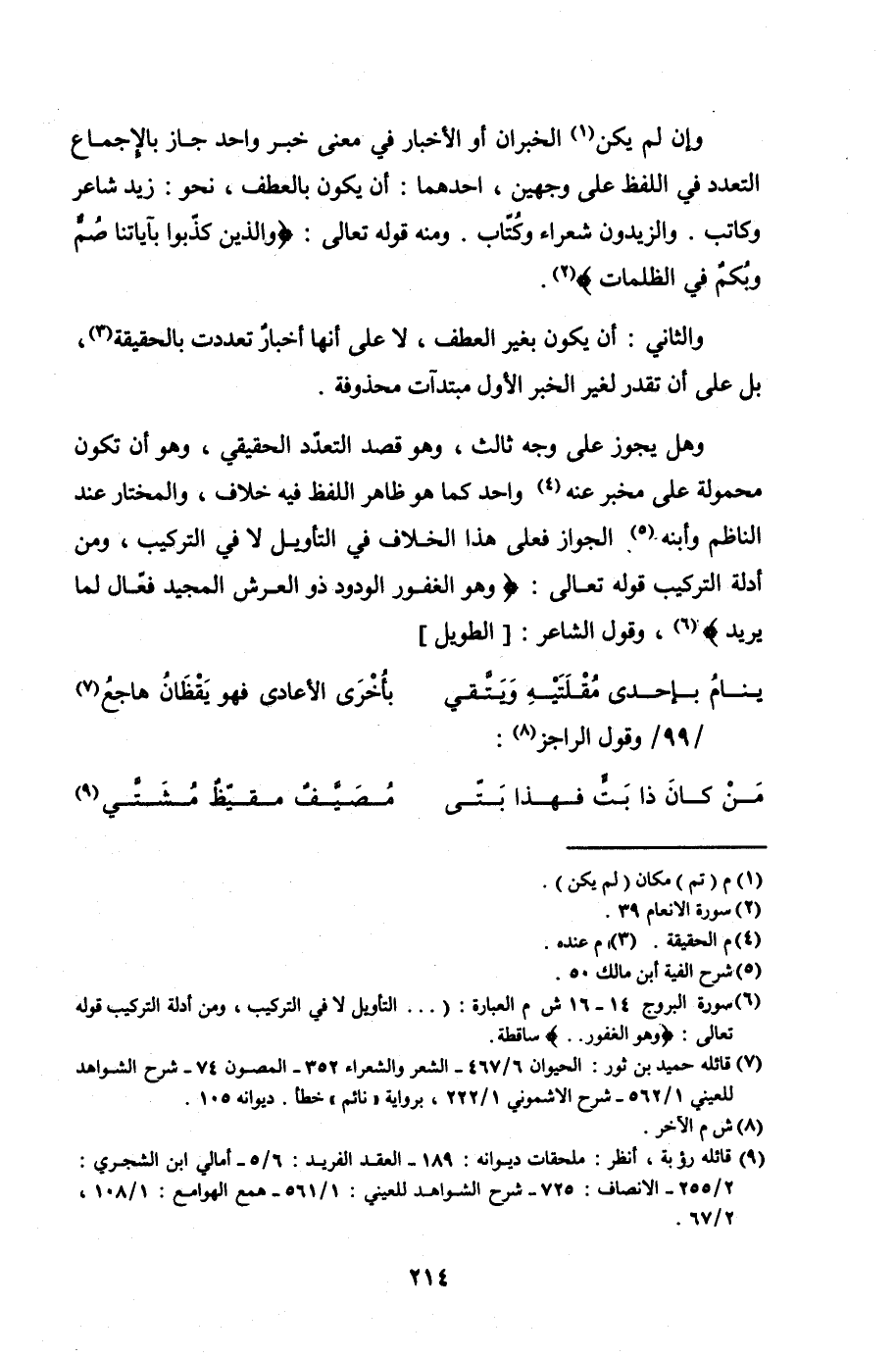 وإن لم يكن الخبران أو الأخبار في معنى خبر واحد جاز بالإجماع التعدد في اللفظ على وجهين، أحدهما: أن يكون بالعطف، نحو: زيد شاعر وكاتب. والزيدون شعراء وكُتاب، ومنه قوله تعالى: {وَالَّذِينَ كَذَّبُوا بِآيَاتِنَا صُمٌّ وَبُكْمٌ فِي الظُّلُمَاتِ}.