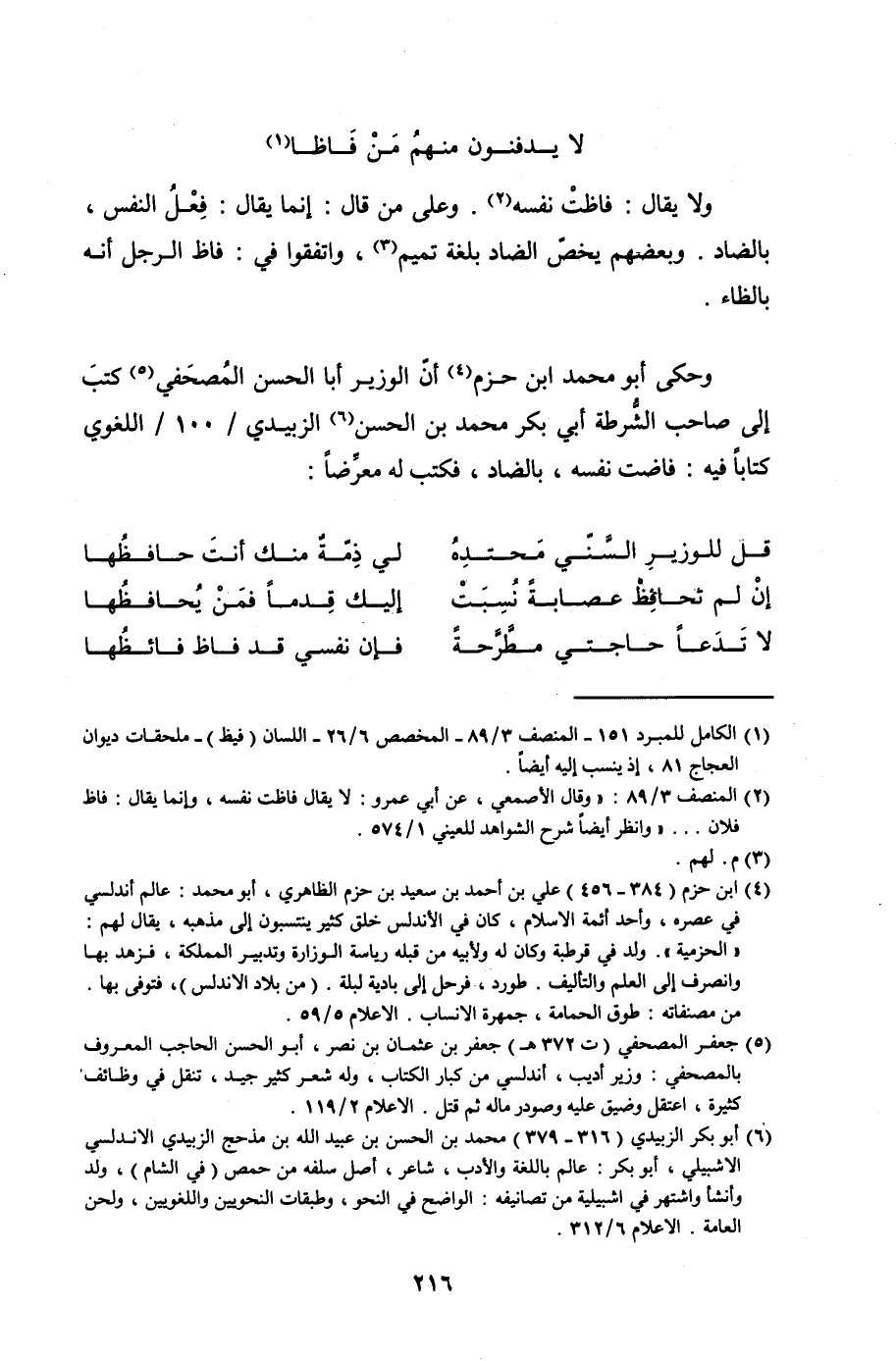 وحكى أبو محمد ابن حزم أنّ الوزير أبا الحسن المُصحَفي كتبَ إلى صاحب الشُّرطة أبي بكر محمد بن الحسن الزبيدي /100/ اللغوي كتابًا فيه: فاضت نفسه، بالضاد، فكتب له معرِّضًا: