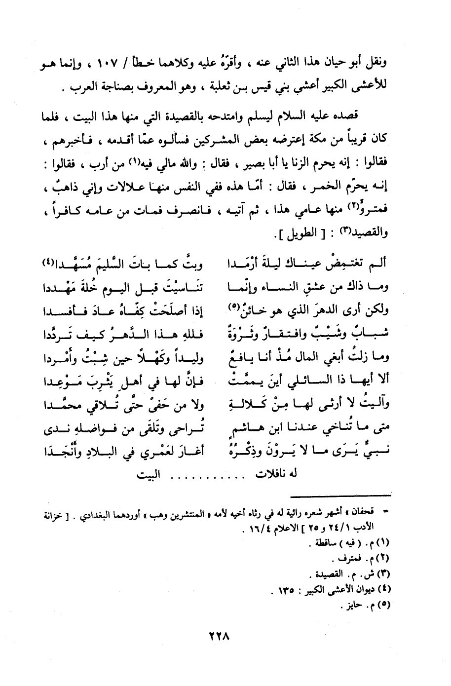 قصده عليه السلام ليسلم وامتدحه بالقصيدة التي منها هذا البيت، فلما كان قريبًا من مكة اعترضه بعض المشركين فسألوه عما أقدمه، فأخبرهم، فقالوا: إنه يحرم الزنا يا أبا بصير، فقال: والله مالي فيه من أرب، فقالوا: إنه يحرّم الخمر، فقال: أمّا هذه ففي النفس منها علالات وإني ذاهبٌ، فمترو منها عامي هذا، ثم آتيه، فانصرف فمات من عامه كافرًا والقصيد: [الطويل].