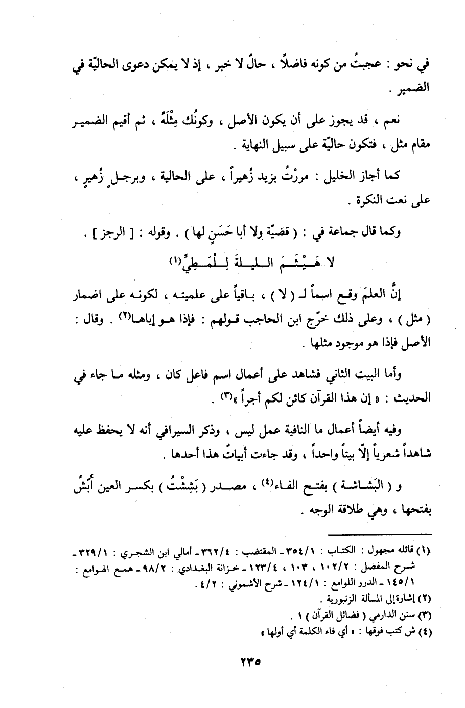 وفيه أيضًا أعمال ما النافية عمل ليس، وذكر السيرافي أنه لا يحفظ عليه شاهدًا شعريًا إلا بيتًا واحدًا، وقد جاءت أبيات هذا أحدها.