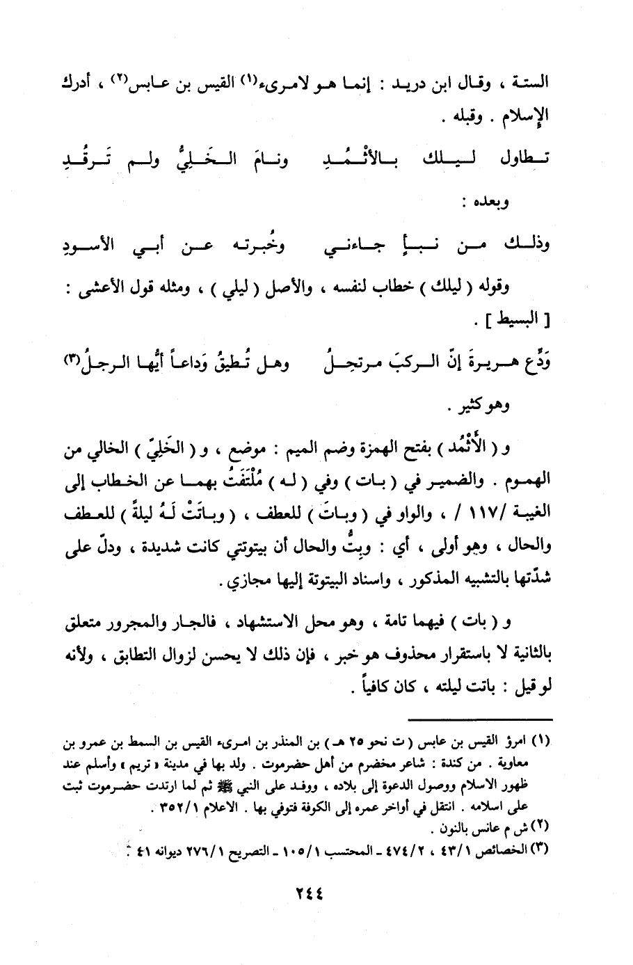 و (الأَثْمُد) بفتح الهمزة وضم الميم: موضع، و (الخَلِيّ) الخالي من الهموم. والضمير في (بات) وفي (له) مُلْتَفَتُ بهما عن الخطاب إلى الغيبة /117/، والواو في (وباتَ) للعطف، و (باتَتْ لَهُ ليلةً) للعطف والحال، وهو أولى، أي: وبِتُّ والحال أن بيتوتتي كانت شديدة، ودلّ على شدتها بالتشبيه المذكور، وإسناد البيتوتة إليها مجازي.