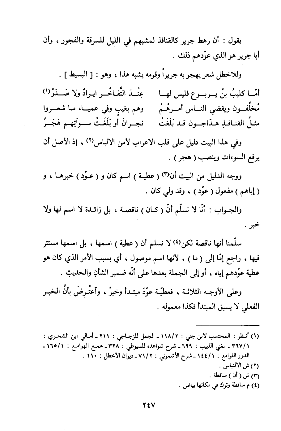 ووجه الدليل من البيت أن (عطية) اسم كان و (عوّد) خبرها، و (إياهم) مفعول (عوّد)، وقد ولي كان.