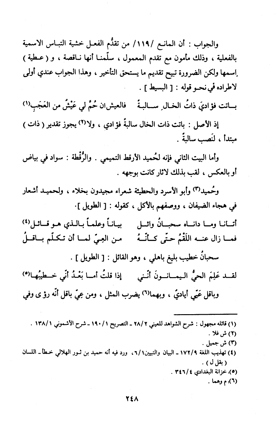 والجواب: أن المانع /119/ من تقدُّم الفعل خشية التباس الاسمية بالفعلية، وذلك مأمون مع تقدم المعمول، سلمنا أنها ناقصة، و (عطية) اسمها ولكن الضرورة تبيح تقديم ما يستحق التأخير، وهذا الجواب عندي أولى لاطراده في نحو قوله: [البسيط].