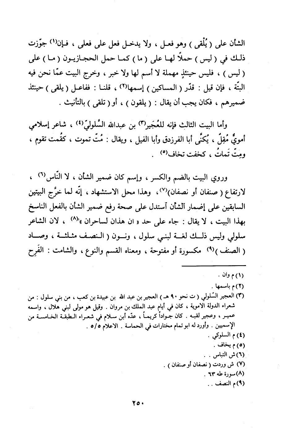 وروى البيت بالضم والكسر، واسم كان ضمير الشأن، لا الناس، لارتفاع (صنفان أو نصفان)، وهذا محل الاستشهاد، إنه لما خرَّج البيتين السابقين على إضمار الشأن استدل على صحة رفع ضمير الشأن بالفعل الناسخ بهذا البيت، لا يقال: جاء على حد {إِنْ هَذَانِ لَسَاحِرَانِ}، لأن الشاعر سلولي وليس ذلك لغة لبني سلول، ونون (النصف مثلثة، وصاد (الصنف) مكسورة أو مفتوحة، ومعناه القسم والنوع، والشامت: الفَرِح