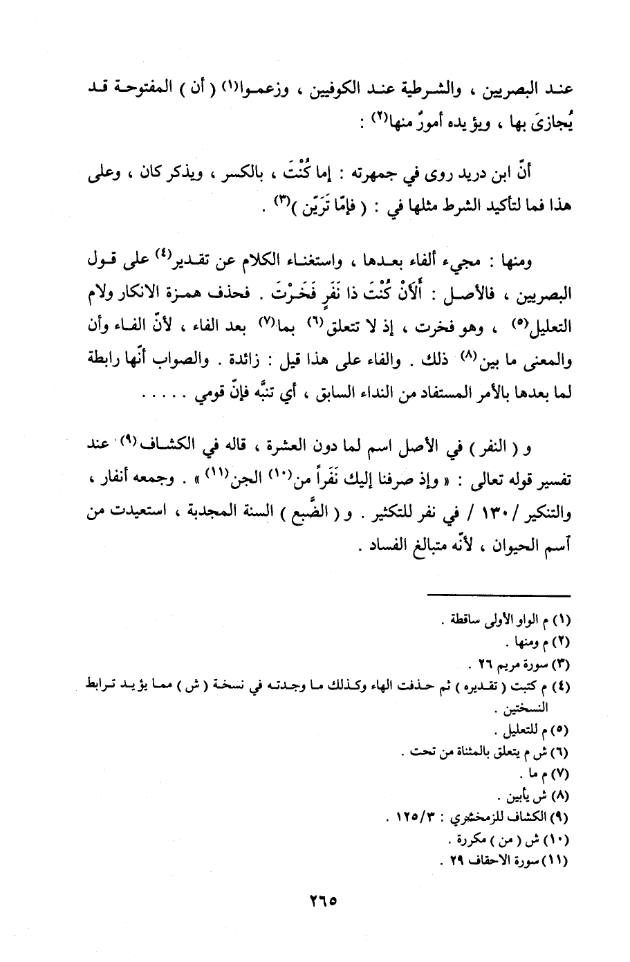 ومنها: مجيء ألفاء بعدها، واستغناء الكلام عن تقدير على قول البصريين، فالأصل: أَلأنْ كُنْتَ ذا نَفَرٍ فَخَرْتَ. فحذف همزة الإنكار ولام التعليل، وهو فخرت، إذ لا تتعلق بما بعد الفاء، لأن الفاء وأن المعنى ما بين ذلك. والفاء على هذا قيل: زائدة. والصواب أنّها رابطة لما بعدها بالأمر المستفاد من النداء السابق، أي تنبه فإن قومي ........