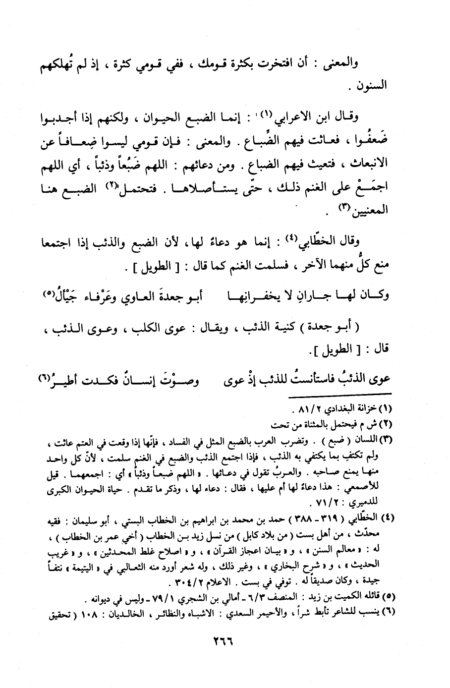 وقال الخطّابي: إنما هو دعاءٌ لها، لأن الضبع والذئب إذا اجتمعا منع كلُّ منهما الآخر، فسلمت الغنم كما قال: [الطويل].