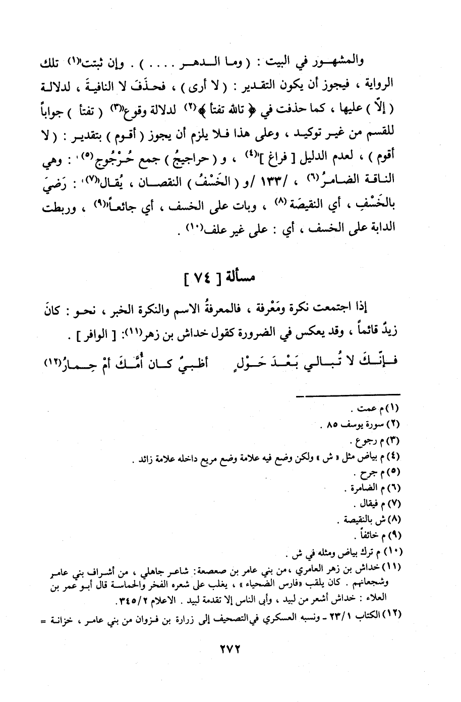 والمشهور في البيت: (وما الدهر ......) وإن ثبتت تلك الرواية، فيجوز أن يكون التقدير: (لا أرى)، فحذف لا النافية، لدلالة (إلا) عليها، كما حذفت في {تَاللَّهِ تَفْتَأُ} لدلالة وقوع "تفتأ" جوابًا للقسم من غير توكيد، وعلى هذا فلا يلزم أن يجوز (أقوم) بتقدير: (لا أقوم) لعدم الدليل [فراغ]، و (حراجيجُ) جمع حُرْجُوج: وهي الناقة الضامر، /133/ و (الخَسْفُ) النقصان، يُقال: رَضيَ بالخَسْفِ، أي النقيصَة، وبات على الخسف، أي جائعًا، وربطت الدابة على الخسف، أي: على غير علف.