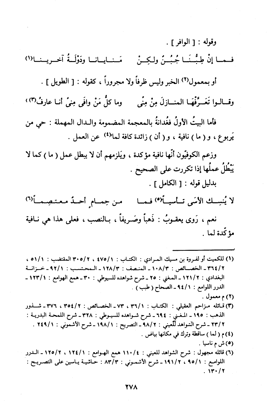 وزعم الكوفيون أنّها نافية مؤكدة، ويَلزمهم أن لا يبطل عمل (ما) كما لا يَبْطُلُ عملُها إذا تكررت على الصحيح.