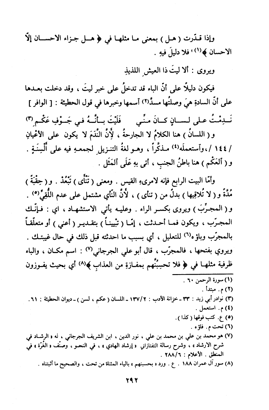 فيكون دليلاً على أن الباء قد تدخل على خبر ليت، وقد دخلت بعدها على أن السادة هي وصلتها مسد اسمها وخبرها في قول الحطيئة: [الوافر]