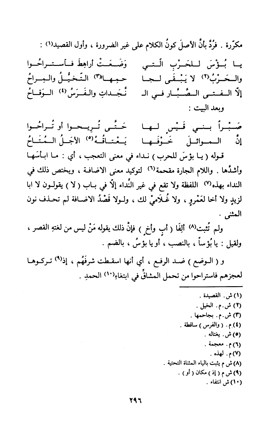 قوله (يا بؤس للحرب) نداء في معنى التعجب، أي: ما ابأسها وأشدها. واللام الجارة مقحمة لتوكيد معنى الإضافة، ويختص ذلك في النداء بهذه اللفظة ولا تقع في غير النداء إلا في باب (لا) يقولون لا أبا لزيد ولا أخا لعمرو، ولا غلامي لك، ولولا قصد الإضافة لم تحذف نون المثنى.