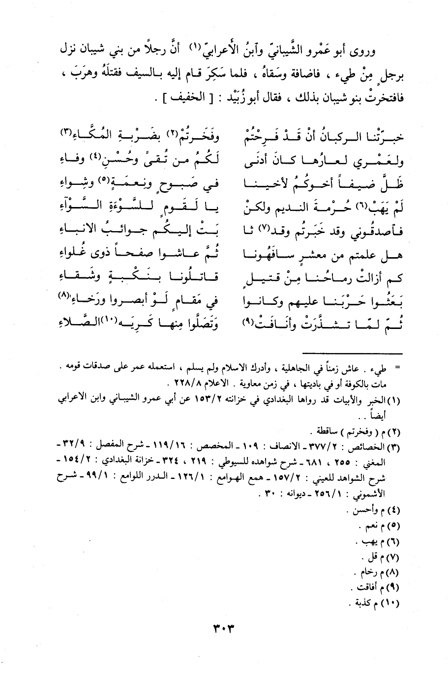 وروى أبو عمرو الشيباني وآبن الأعرابي أن رجلا من بني شيبان نزل برجل من طئ، فاضافة وسقاه، فلما سكر قام إليه بالسيف فقلته وهرب، فافتخرت بنو شيبان بذلك، فقال أبو زبيد: (الخفيف).