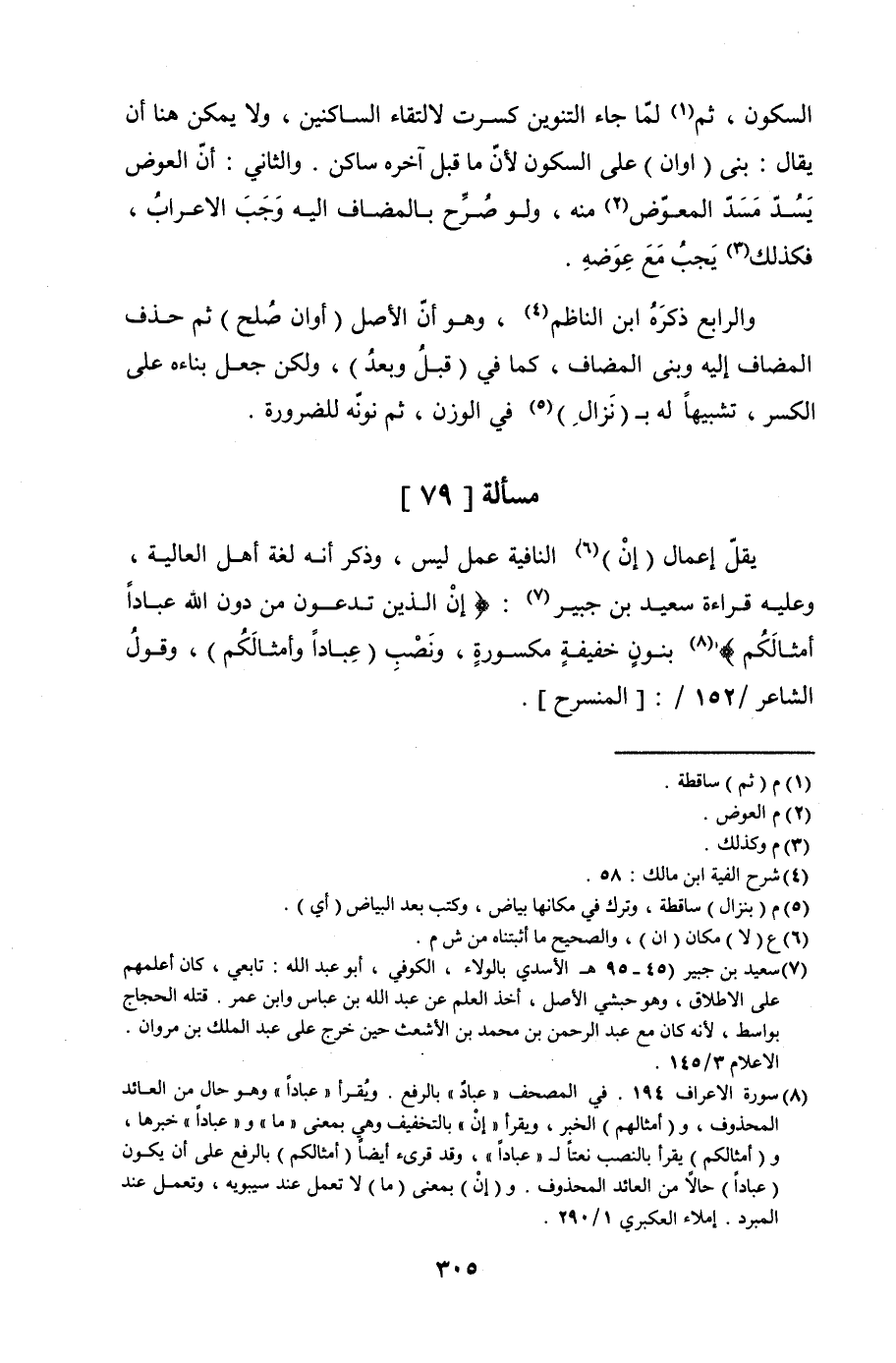 (إن الذين تدعون من دون الله عبادا أمثالكم) بنون خفيفة مكسورة، ونصب {عِبادًا أمثالَكُمْ}، وقول الشاعر/ /: (المنسرح).