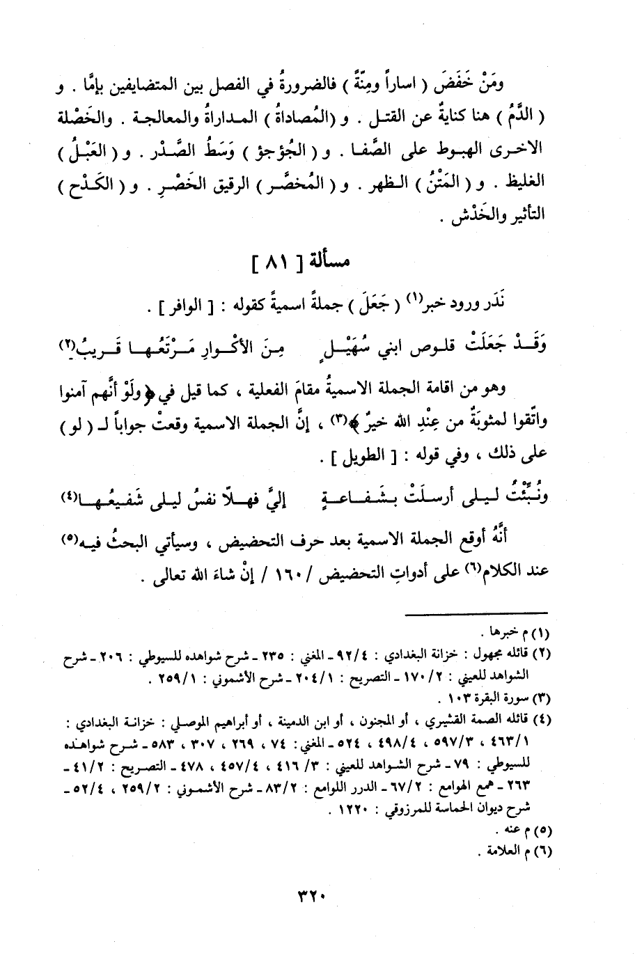 ومن خفض (اسارا ومنة) فالضرورة في الفصل بين المتضايقين بإما. و (الدم) هنا كناية عن القتل. و (المصاداة) المداراة والمعالجة. والخصلة الأخرى الهبوط على الصفا. و (الجؤجؤ) وسط الصدر. و (العبل) الغليظ. و (المتن) الظهر. و (المخصر) الرقيق الخصر. و (الكدح) التأثير والخدش.