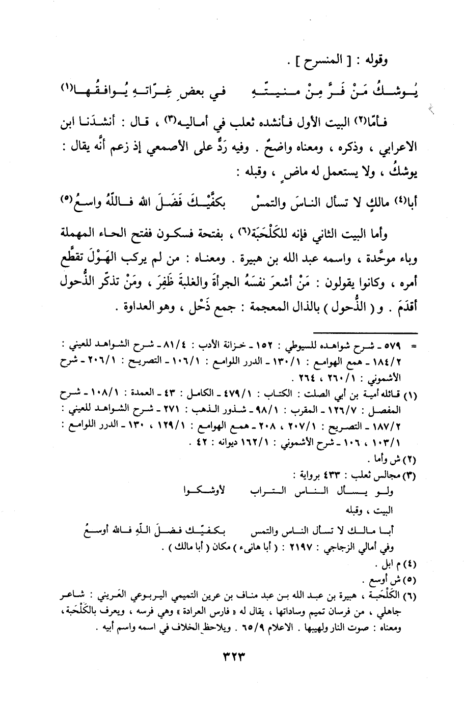 وأما البيت الثاني فإنه للكلحبة، بفتحة فسكون ففتح الحاء المهملة وباء موحدة، واسمه عبد الله بن هبيرة. ومعناه: من لم يركب الهول تقطع أمره، وكانوا يقولون: من أشعر نفسه الجرأة والغلبة ظفر، ومن تذكر الذحول أقدم. و (الذحول) بالذال المعجمة: جمع ذحل، وهو العداوة.