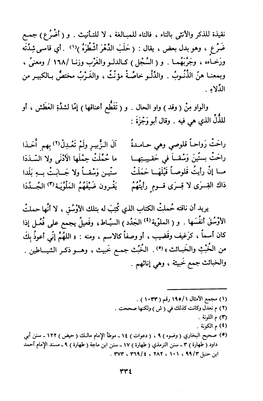 نقيدة للذكر والنثى بالتاء، فالتاء للمبالغة، لا للتأنيث. و (أضرع) جمع ضرع، وهو بدل بعض، يقال: (حلب الدهر أشطره). أي قاسى شدته ورخاءه، وجربهما. والدلو خاصة مؤنث، والغرب مختص بالكبير من الدلاء.