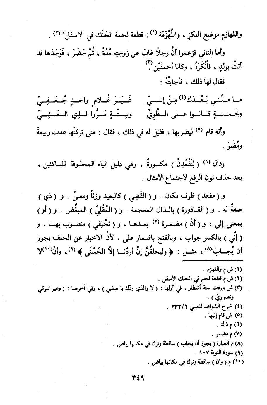 و (مقعد) ظرف مكان. و (القصي) كالبعيد وزناً ومعنى. و (ذي) صفة له. و (القاذورة) بالذال المعجمة. و (المقلي) المبغض. و (أو) بمعنى إلى، و (أن) مضمرة بعدها، و (تحلفي) منصوب بها. و (إني) بالكسر جواب، وبالفتح باضمار على، لأن الإخبار عن الحلف يجوز أن يجاب، مثل: (وليحلفن إن أردنا إلا الحسنى)، وأن لا