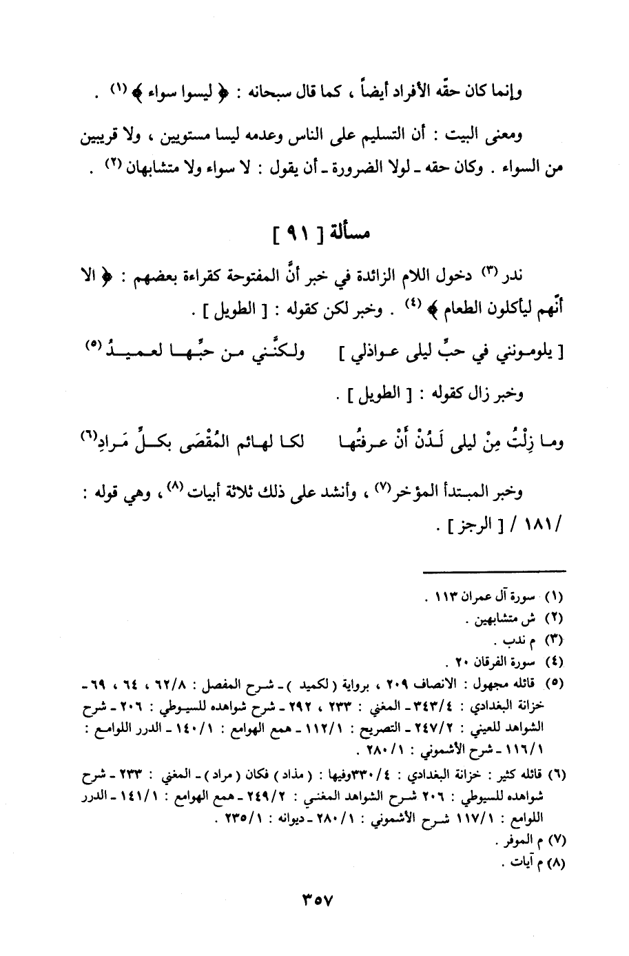 ومعنى البيت: أن التسليم على الناس وعدمه ليسا مستويين، ولا قريبين من السواء. وكان حقه - لولا الضرورة - أن يقول: لا سواء ولا متشابهان.