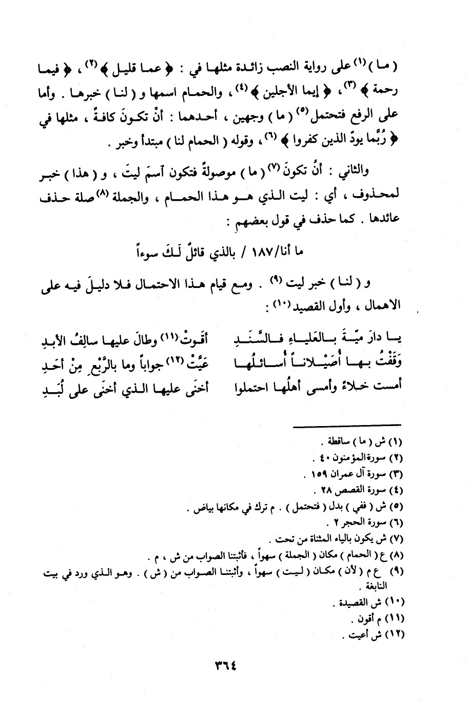 والثاني: أن تكون (ما) موصولة فتكون اسم ليت، و (هذا) خبر لمحذوف، أي: ليت الذي هو هذا الحمام، والجملة صلة حذف عائدها. كما حذف في قول بعضهم.