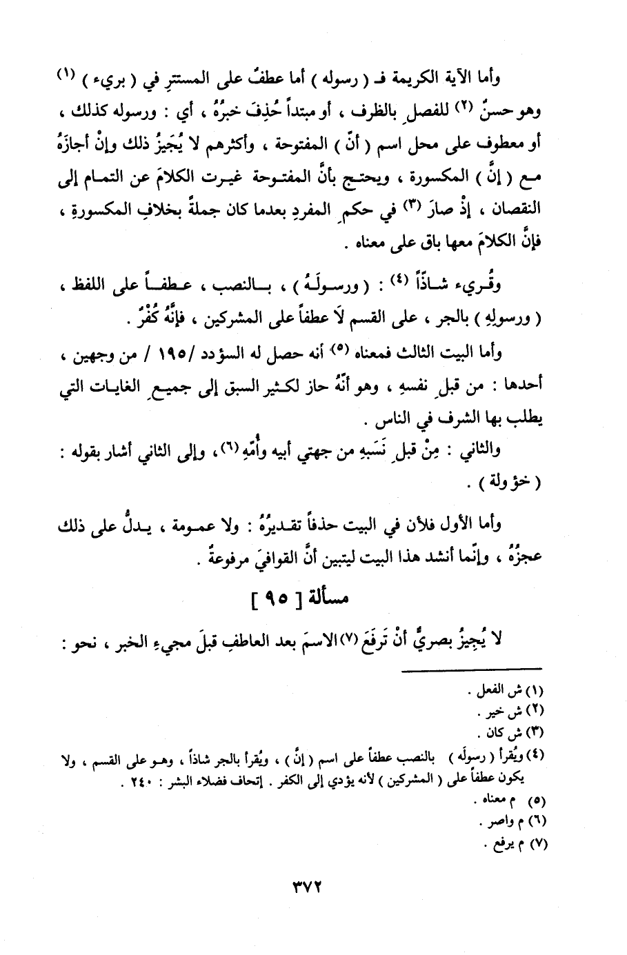 وهو حسن للفصل بالظرف، أو مبتدأ حذف خبره، أي: ورسوله كذلك، أو معطوف على محل اسم (أن) المفتوحة، وأكثرهم لا يجيز ذلك وإن أجازه مع (إن) المكسورة، ويحتج بأن المفتوحة غيرت الكلام عن التمام إلى النقصان، إذ صار في حكم المفرد بعدما كان جملة بخلاف المكسورة، فإن الكلام معها باق على معناه.